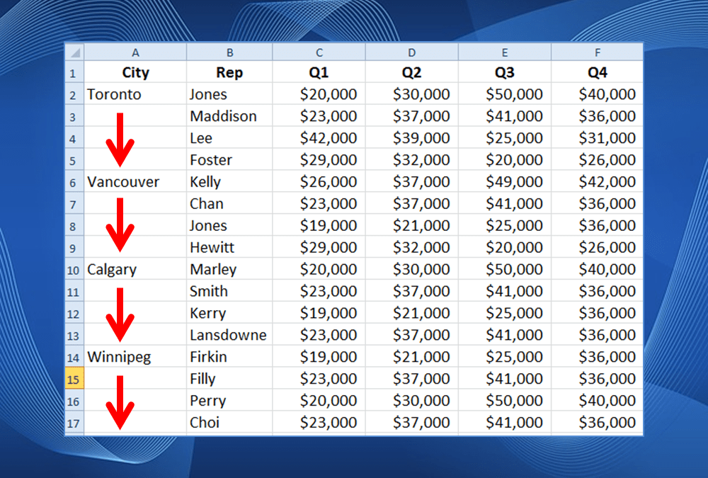 Fill or replace blank cells in Excel with a value from a cell above with worksheet of cities.